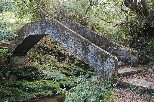 樓仔厝古道越嶺點,比繞著蜿蜒的北勢溪走快捷,且避開溪岸難行之處。不久一小段石階往下,古道再度回到北勢溪岸,附近開始出現農地。H428m |