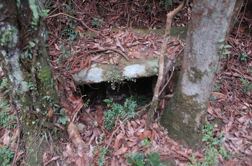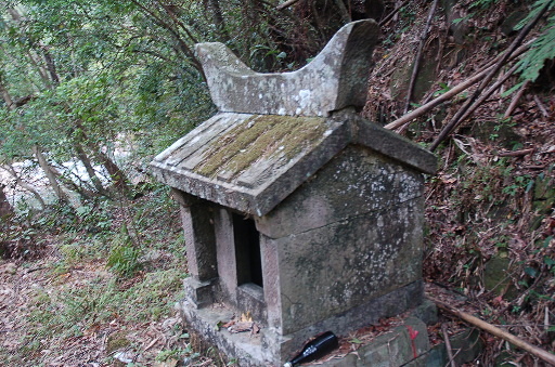 石棚,四塊石板組成的簡陋小廟搭在幾棵樹旁,不顯眼。H395m |