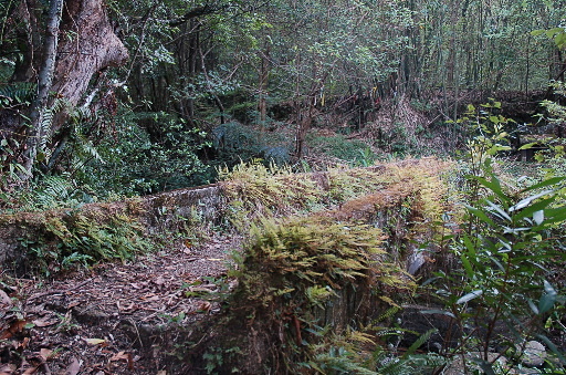 古厝遺址,廢棄石厝只剩殘牆。過後古道再度緩上離溪越嶺。H425m |