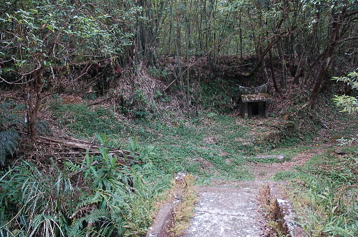 竹子山古道叉路,位於水泥橋頭,路旁有座古老的石砌小土地公廟,福德祠,建於明治甲辰年(明治37年、1904年)。左上為竹子山古道往橫山,續前行。H389m |