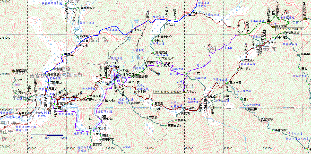 回到樓仔二號橋,從大平21-1號取右才是正路,取左往虎豹潭古道。H398m |