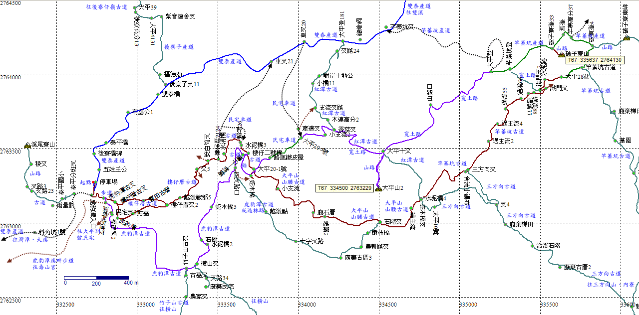 四叉路口,左下古道過溪往大平21-1號,右為虎豹潭古道往虎豹潭入口,直行緩上往三方向山,取右。這段古道上有很多根木電桿,竹子山高分。H418m |