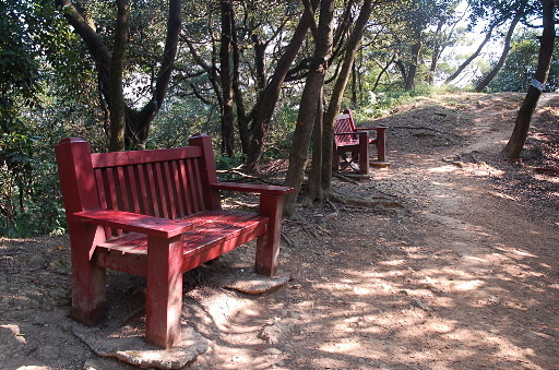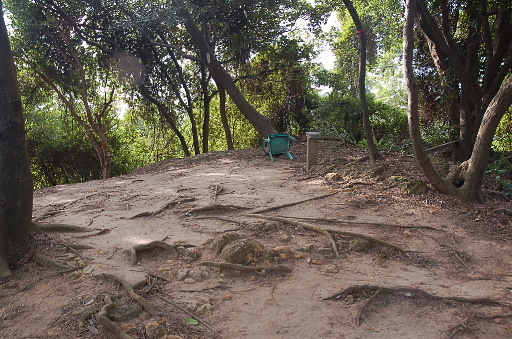石灰坑山,374m,三等三角點九七八號。山頂有人整理,設有一座小小廟。續行可下石灰坑產道,往山佳或連登大棟山。樹下木椅休息。休息後原路退回。H361m |
