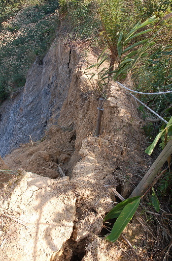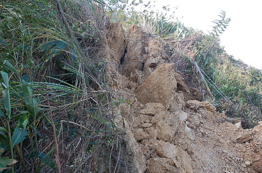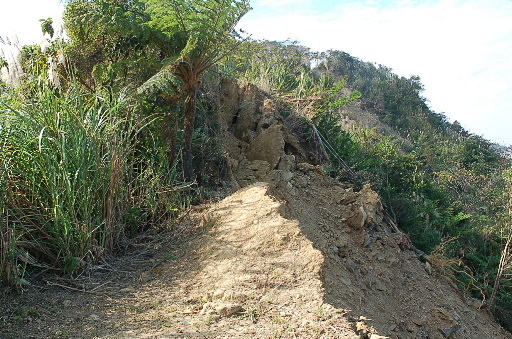 步道崩塌,右下方因超挖泥土,造成大崩塌,先前整建的步道已塌陷約10公尺。不想放棄大湖山,亦不想繞路登大湖山,最後決定硬闖崩塌區上緣草叢,雨天或雨後土石鬆軟之時不建議硬闖。H174m |