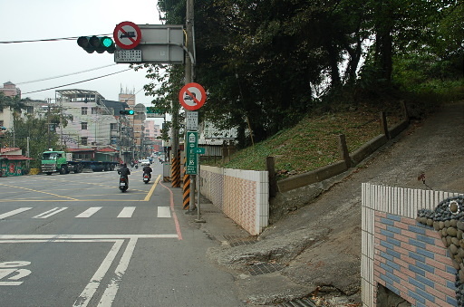 尖山叉路,位於中正二路即將轉為中正三路前,右上水泥小車道往公墓,取之登尖山。稍後即可見零星墓園。H65m |