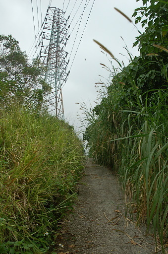 電塔002(鶯南-鶯北線、鶯南-樹焚線,另有編號006,大湳-鶯南線、松樹-鶯南線)。續行仍為水泥小車道,但雜草較多。眺望大地園山。H110m |