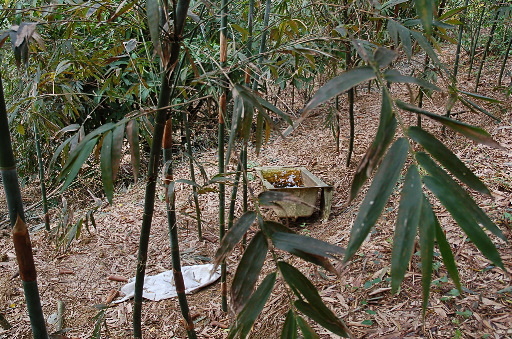 竹園邊竹叢缺口,輕鬆回到竹園,但此入口並不顯眼,剛才路過時有看到此口,但覺得稜線看起來不好走而沒利用。缺口附近有廢棄浴缸儲水槽。H173m |