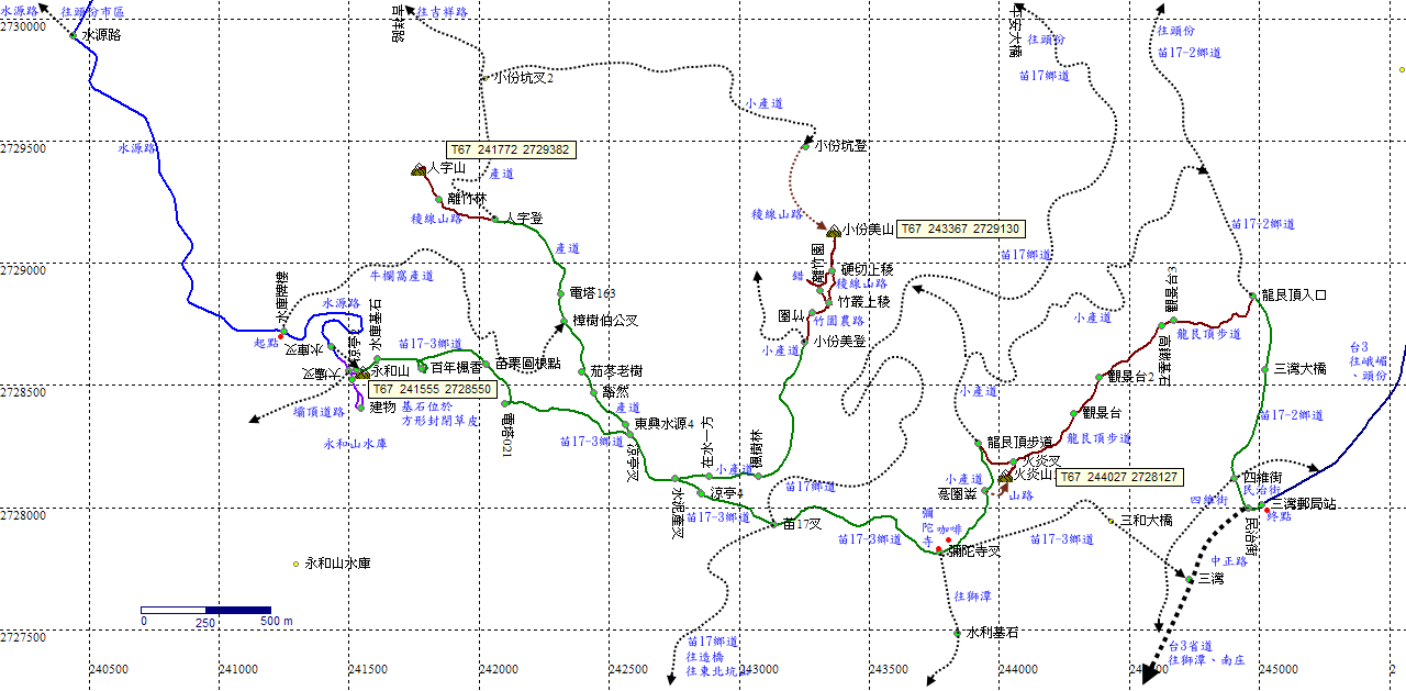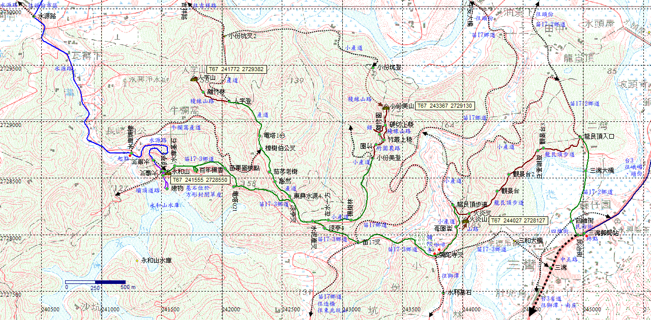 回到尿祭仔叉路涼亭,續行苗17-3鄉道往三灣。H152m |