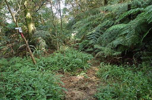 水庫叉路,直行往水庫車道,禁區勿入,右上往猴洞崙約50-60分,取右,山路一路爬坡向上,但路況良好。稜線上隱約可俯瞰翡翠水庫大壩,可惜遮遮掩掩看不真切。偶可遠眺新店的猴洞尖,跟現在爬的這座猴洞崙算是一對。H227m |