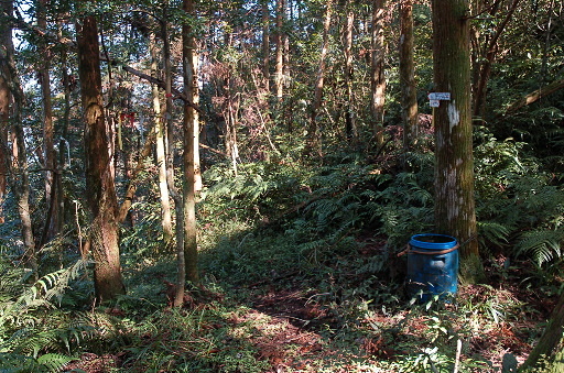 藍色水桶叉路,左為山腰路,右為稜線路,二線相通,10分會合,往坑內山約15分、翡翠谷山約45分,左路較明顯,取左。山腰路林下長了很多的大菁,冬天剛好賞花。H434m |