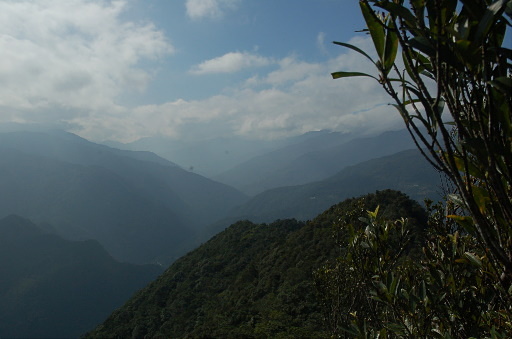稜線岩地,懸崖邊風大但有展望,可遠眺塗潭山、俯瞰南勢溪。續循稜登上中途唯一明顯山頭,但忘了定位,難得的下坡途中有個避風的長形空地。H588m |