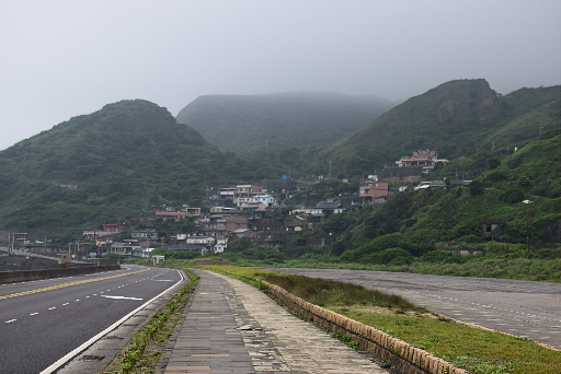 搭基隆客運791(國家新城→福隆)到水湳洞站,本來是應該搭到下一站的,但從這裡開始走可以眺望水湳山、長仁山、十三層遺址,展望很棒。出發,循濱海公路往船塢站。稍後在長仁山山腳可見一海蝕洞,應該就是水湳洞地名的由來。H13m |