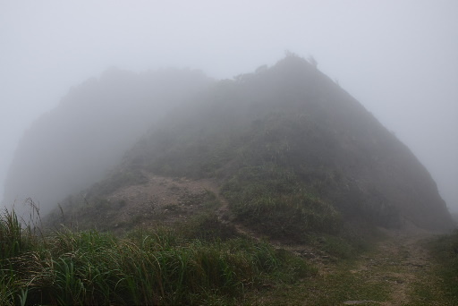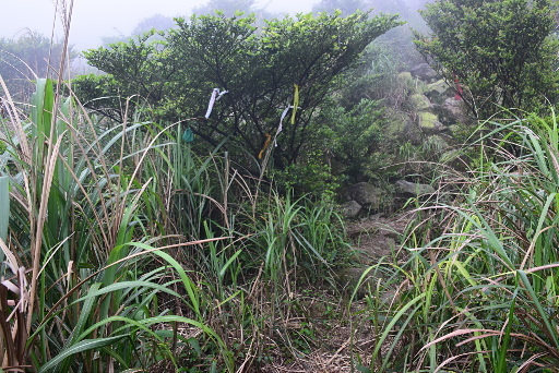 續行,取左上正式爬上煙囪稜,稜線山路路況極佳,展望本佳,可惜今日雲霧瀰漫,能見度只有十幾公尺,無景可賞。 |
