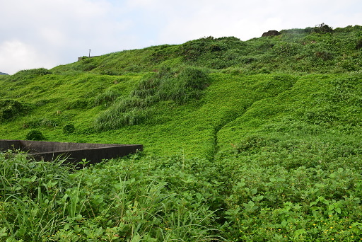 續行,取右循半平山水管路往金瓜石,路況極佳。從水管路眺望一號廢煙管大煙囪附近,可得知一號廢煙管末段是藉由礦坑來穿越煙囪稜,不像二號、三號廢煙管是直接爬上稜線。 |