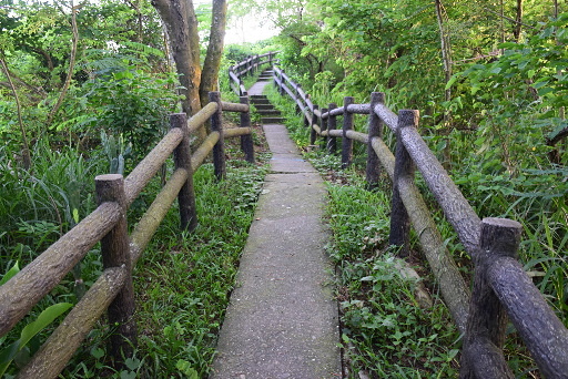 石筆初開休息區,石筆初開是從盛發園的右前方突兀而出的一根筆狀圓柱,可是我不曉得盛發園在哪?望不見此奇岩。這個休息區頗大,還設有公廁。續行步道往下。H116m |