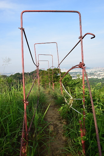 涼亭,叉路,左陡下步道已有點荒廢,續行稜線步道。過了猴子山前山頭有急陡下路段,設有鐵扶手。H147m |
