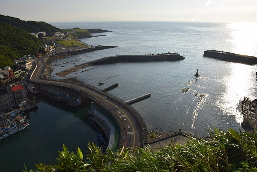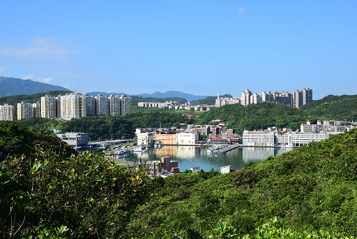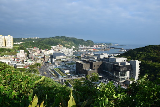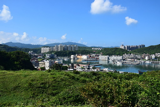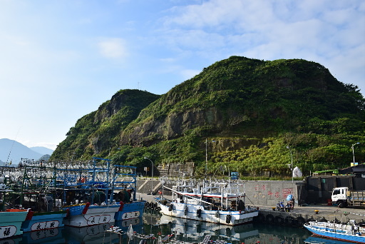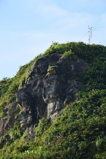 長潭里漁港,位於海科館主題館旁邊,這裡剛好可以仰望容軒步道經過的小山頭,遺有砲座的天線山頭下方是曾經登上新聞版面的『猩猩臉』奇岩,要看出一公一母兩猩猩需要一點想像力。H6m |