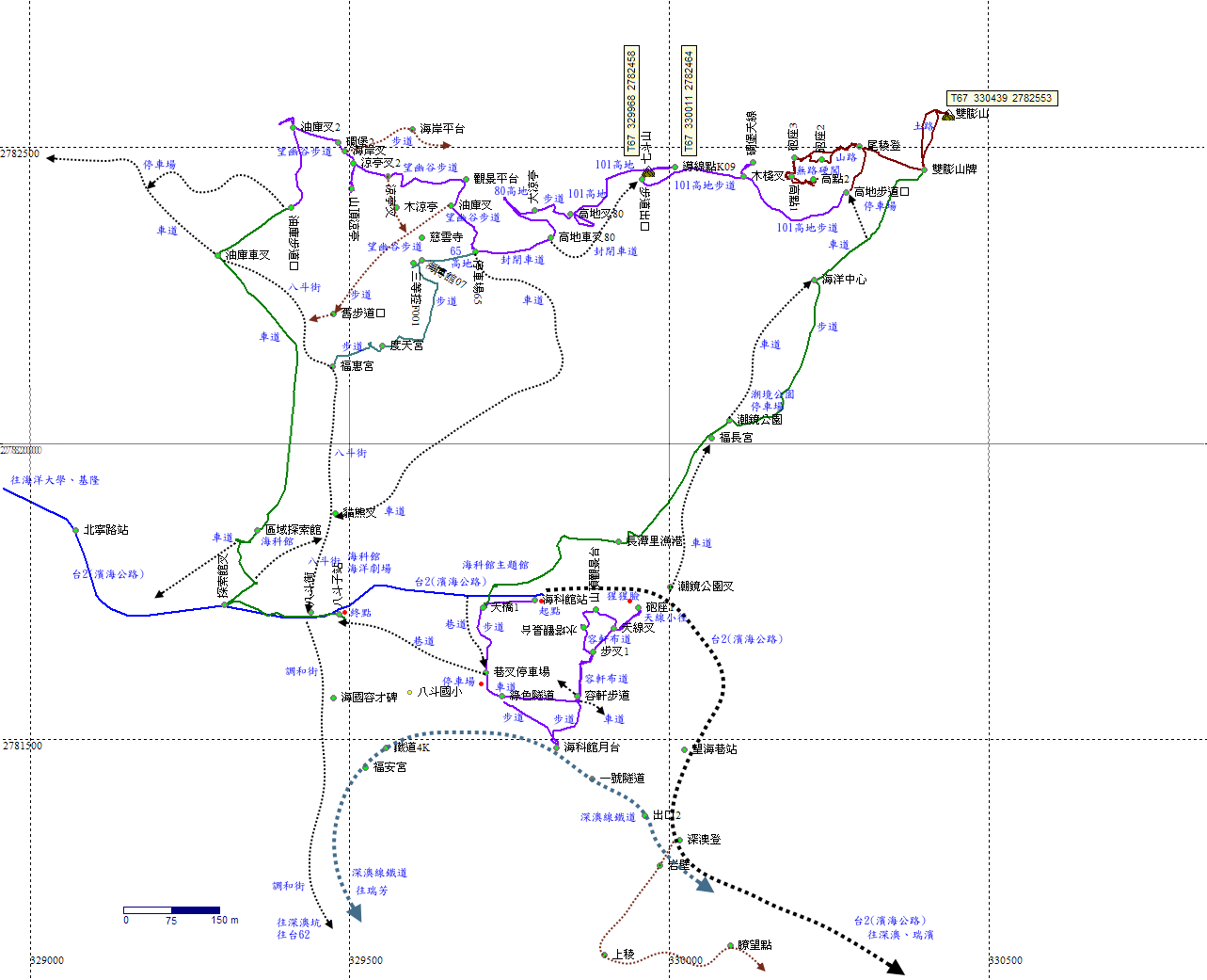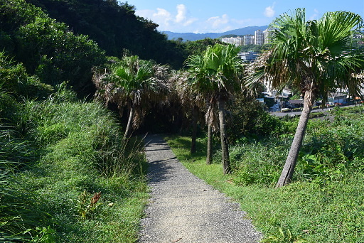 回到容軒步道入口,穿越車道有步道直下往台鐵海科館站,取之。H32m |