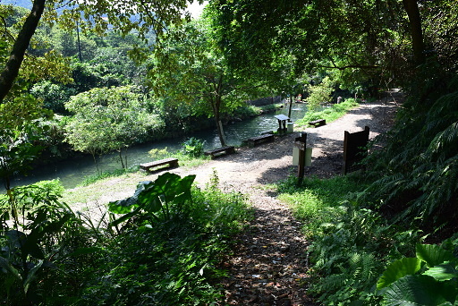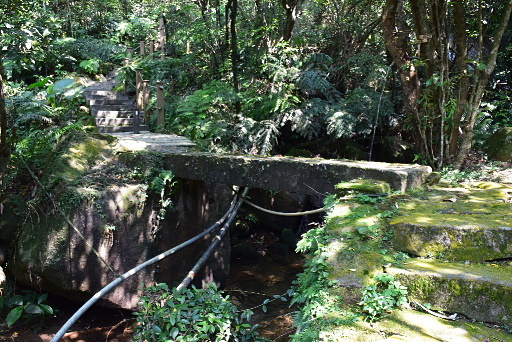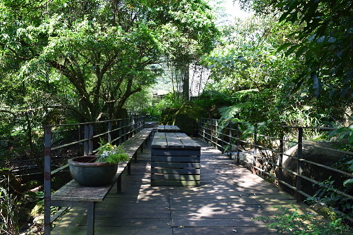 石板橋,左側不遠處可見有大石磐的小瀑布,因時間不足,且不見明顯路徑,省略。附近設有木桌椅可休息,右側再過去一點亦屬食養山房。H199m |