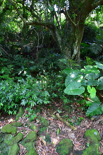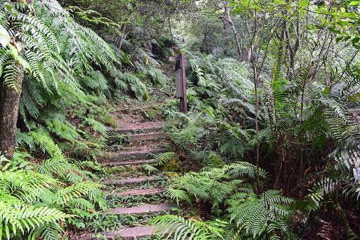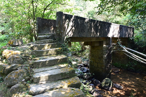 有應公廟,古老的石砌小廟爬滿蕨葉,背後有棵大樹,似乎已經很久沒人造訪了。過竹園後,以前的崩塌地已架設了多處木棧橋,變得很好走。H193m |