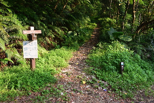 低繞路叉路,左低繞山路可回無名峰,標示往新山,而稜線路則標示往新山東稜,這或許是低繞路仍有人走的原因。續前行往七分寮產道、五指山、友蚋山。過最低鞍後開始一路往上,略陡,路況仍佳。H404m |