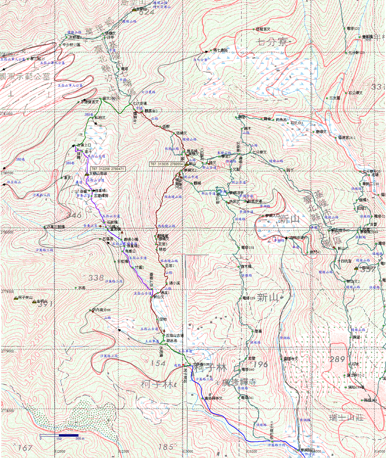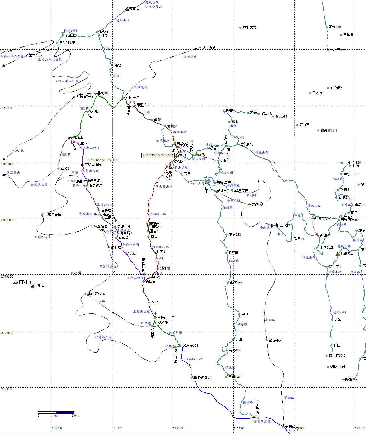 友蚋山南峰(新山西嶺),340m,礦務課第二百六十一號基石。基石位於古道越嶺點路旁,續行開始陡下。此處又稱頂坪過火埔。H345m |