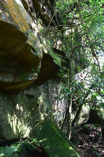 和尚頭山下方岩壁,山路轉為一路往下,除了有些崎嶇,有些濕滑,路況還算不差。偶爾回頭,僅能看到岩壁一隅,不像在茄苳古道某處,可眺望整個和尚頭山,可了解山名的由來。H481m |
