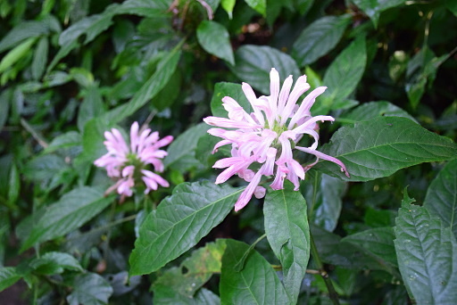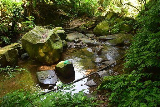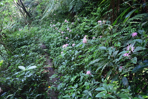 過主流上游,小心踏石而過,溪畔大石上竟然有石桌椅。過溪後立刻遇叉路,左下往茄苳瀑布,右上可接茄苳古道主線,取左。附近溪流有不少可親溪處。園藝植物串心花在這裡居然變成路旁的野花。H345m |
