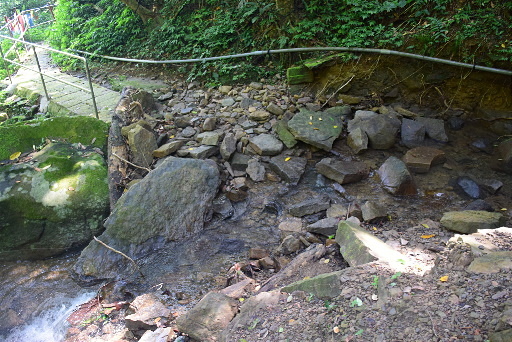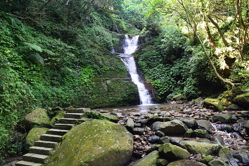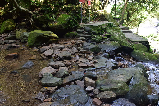 第二次過主流,溪床較為寬廣,小心踏石而過。稍後立刻再過溪,即抵茄苳瀑布步道終點。石階步道旁可俯瞰茄苳瀑布,步道漸遠離,再繞回瀑布下方。H251m |