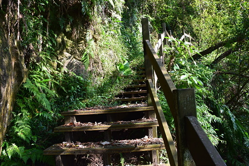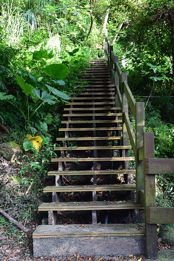 石津宮,位於石崁產道叉路口,石崁步道入口就在廟旁,標示清楚。『石崁森林浴步道長210公尺可直達麥芽膏』,一開始是水泥階梯直上,稍後即轉為木棧道,階梯上赫然有隻藍磯鶇來引路一小段。石崁步道似乎是古道所改建,木棧道底下可見水管與古老石階。這條步道缺乏亮點,乏人問津,已經有點雜草叢生。H98m |
