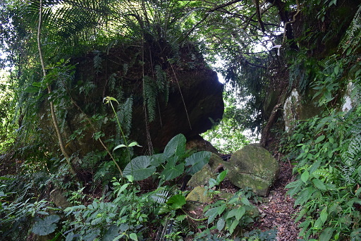 威靈岩,小廟仍有香火,水泥路到此為止。續行通過石門,轉為古老的石階往下。H222m |