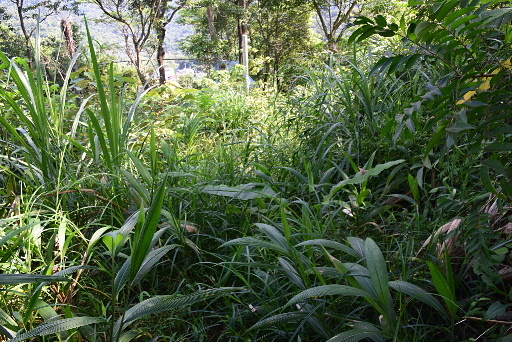 串空湖福德宮,位於車道路底,續行走廊往下,立刻轉為古道,原本的石階已雜草叢生。古道的石階掩藏在雜草之中,下腳得更小心,走起來很累。H201m |