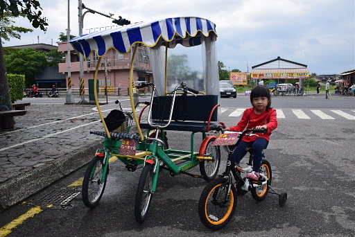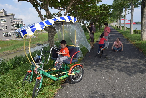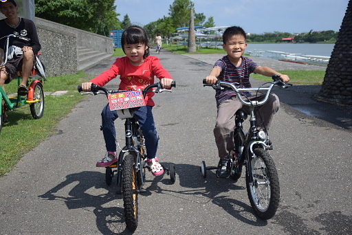 冬山河親水公園,大門口有租車店,免費停車,租腳踏車進入公園。冬山河堤防上的自行車道頗長,不過小朋友腳力難及遠,我們淺嚐即止。H2m |