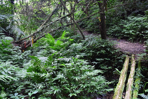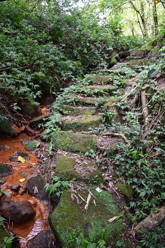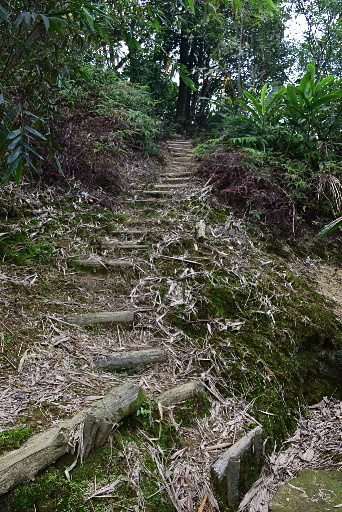 雷公埤古道叉路,位於第二座樹幹橋處,直行過橋的路較明顯,往秀峰路、中嶺山、雞心尖,左下為雷公埤古道,路況較差,往雷公坡福德祠,取左,取刀稍微清理路徑。古道腰繞漸漸偏離溪邊,之後再循一層層的駁坎往下。H433m |