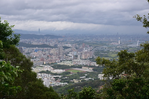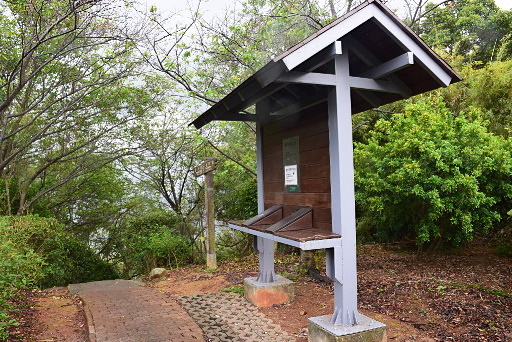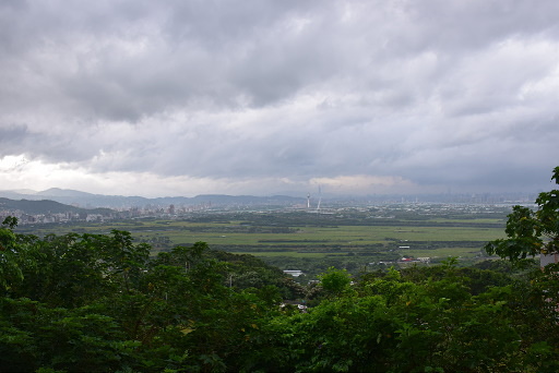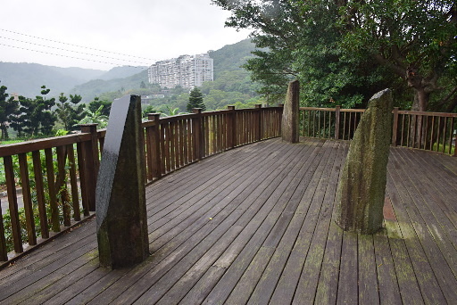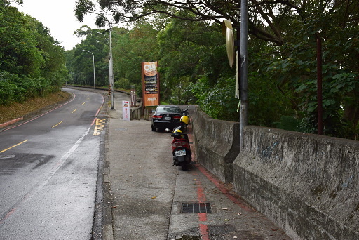石柱觀景台,位於學園路旁,往淡水方向的展望本應不錯,可惜天候不佳。續行學園路。H131m |