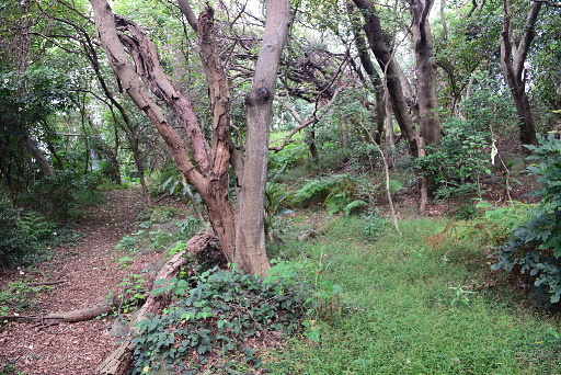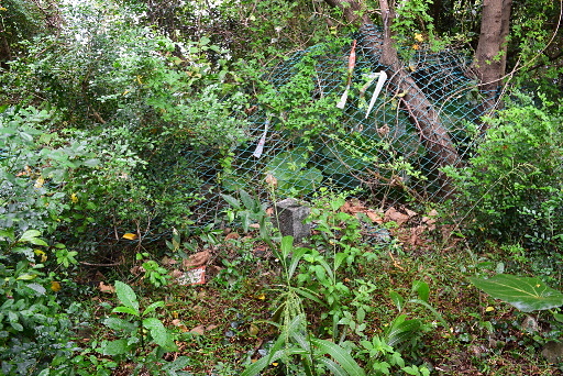 山路叉路,依登山路條取右進入樹林,山路並不明顯,但附近樹林穿梭容易,似乎有好幾種走法,路線分歧。最後山路會經過學園路超高的擋土牆邊緣。H121m |