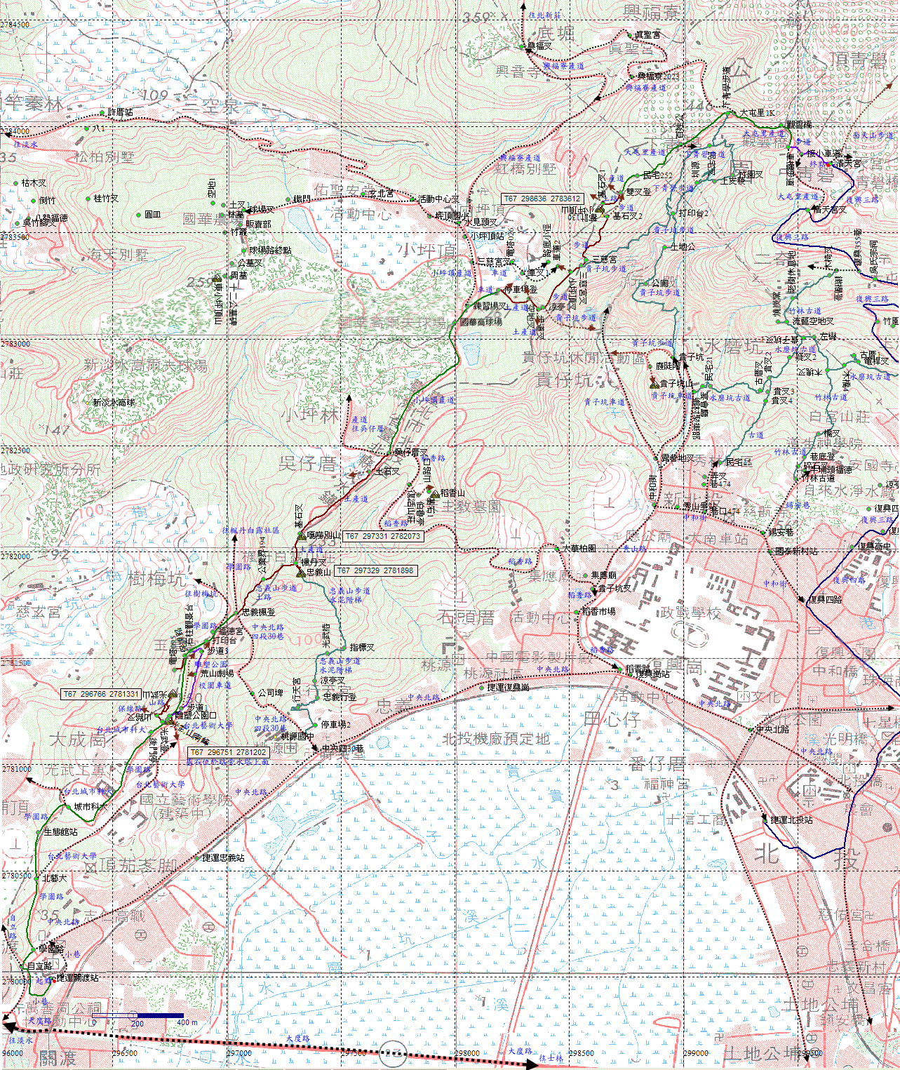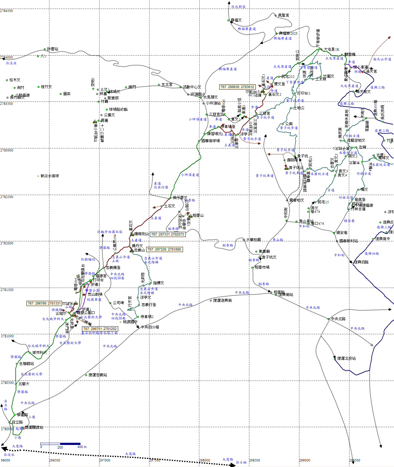 楓丹白露社區叉路,設有木指標柱,左往小坪頂,右往行天宮,取右登頂再回。H222m |
