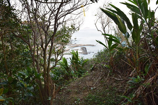 岩石山頭,可俯瞰剛才的上層展望點、濱海公路。續行往斷稜山頭的路一開始很好走,不久往左越稜轉為腰繞山路。最後轉為連續攀繩急陡上,因為可資利用的樹幹有限,山友架了很多粗繩輔助,攀爬頗費氣力,且容易有小落土,上方有人時要留意。H155m |