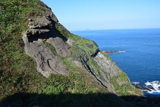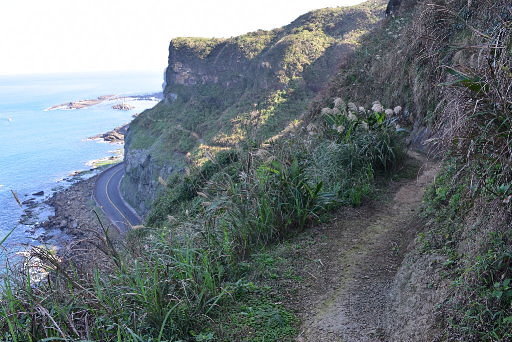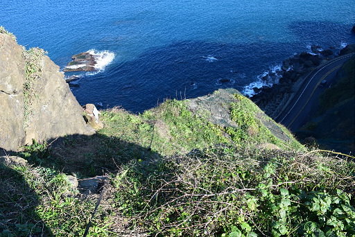 濱海公路邊坡岩頂,這條山路應該是邊坡施工所開,可以一路往右緩降,展望極佳,可鳥瞰濱海公路。從這裡看剛才通過的驚險岩坡,遠望頗為驚人。H91m |