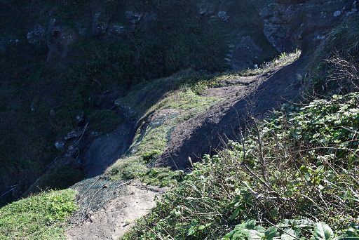 驚險的岩坡,攀繩而下,雖然不算太陡,但岩坡滑下去就是濱海公路,望之令人腳軟,有這繩子拉著,比較安心。接著橫切岩坡,通過時重心放低,其實還好。H76m |