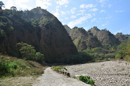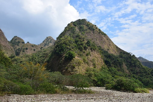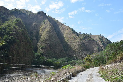 九九峰叉路,左為農投草6號道路(中心道路、九九峰林道)往九九峰,直行往石灼子,取左。這條產道有點小條,會車不易。不久車道就直接開在完全看不到一滴水的烏溪支流乾溪的河床上。兩旁的山峰雖然不甚高,卻陡如峭壁直立,幾乎不可能攀登。這條中心道路(九九峰林道)深入九九峰自然保留區,兩旁的特殊地質景觀讓漫長的旅途不會無聊。H214m |