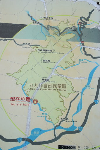 中心橋,設有九九峰自然保留區解說牌,原來九九峰步道不在保留區內,而這條道路也只通過其南緣,保留區跨越草屯、國姓、霧峰三個行政區。此後中心道路(九九峰林道)改行乾溪右岸(上行時的左側)。H288m |