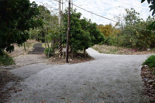九九峰步道叉路,主線道路左彎,續繞九九峰生態藝術園區,直行往九九峰步道,路幅變小,開車者最好停放在這個路口附近,再步行進入。直行。H255m |
