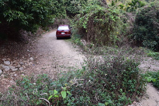 九九峰步道北登山口,轉為小產道,小產道很難會車,且此處並無停車空間,但居然有人把車子開上來。循產道緩降回南登山口。H424m |