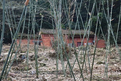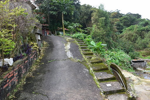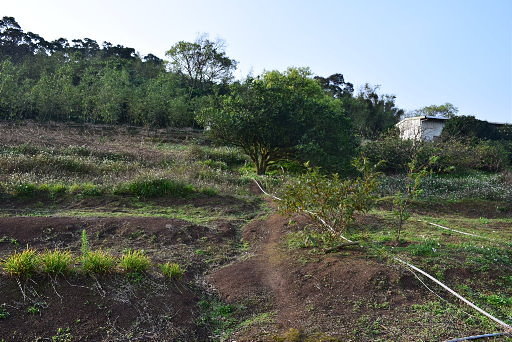 巷底民宅,直行轉為農地小徑,雖然在不遠處的山腰隱約可見有水圳通過,但沒有看到明顯路徑直往,因此暫時先續行好走農地小徑。最後直到離水圳已不遠,才經由竹園抵達右側的水圳。H50m |