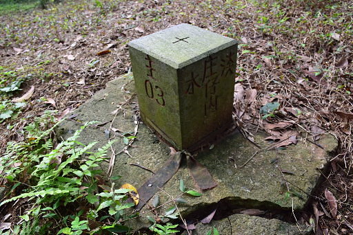 淡水庄仔內‧主03基石,位於電塔054(核一-頂湖紅線、白線)旁,本來山友多以此為虎頭山山頂,但後來發現真正的山頂還有另一顆基石,這裡還不是山頭最高處。續行轉為好走的山路緩上。H133m |