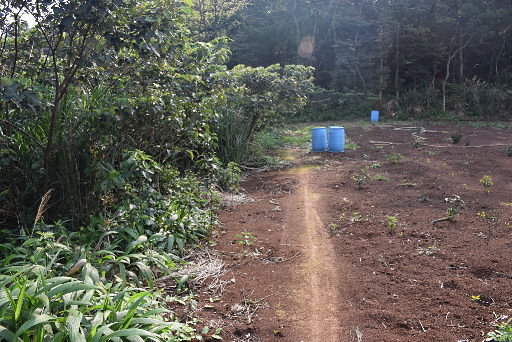 茶園入口,有幾個藍色水桶,續行轉為土產道往外。H255m |