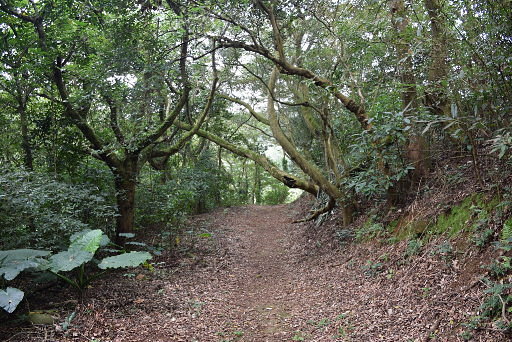 山路入口,雖不見路條,但高大的灌木叢間隱約可見小徑,不久果然出現登山路條。入樹林後路況轉佳,但山路轉陡下。中途的陡坡遇倒木阻道,低身鑽過。這條山路據說是一條古道,某些路段有古老的石階出現。H250m |