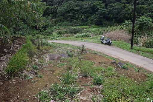 水泥路叉路,右側水泥路通往忠愛街底民宅,遠處可見台2省道上的大自然Hotel,由此登虎頭山就不必走那麼長的馬路與水圳道了,回程再探。續往上。H70m |