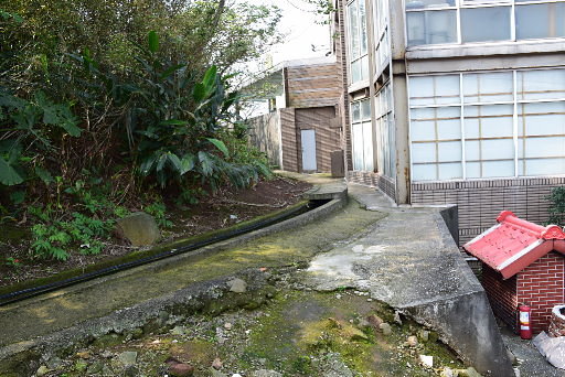 忠愛街15號民宅,從其門口的鐵鍊處下來。循忠愛街可接鄧公路或學府路往捷運淡水站,會從淡金路(台2、登輝大道)下方通過。立刻再遇中層水圳,決定取左跟著它往大自然Hotel靠近。H71m |